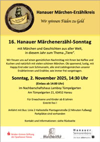 Öffentliche Veranstaltungen des Hanauer Märchen-Erzählkreises finden Sie auch im Veranstaltungskalender der Stadt Hanau.